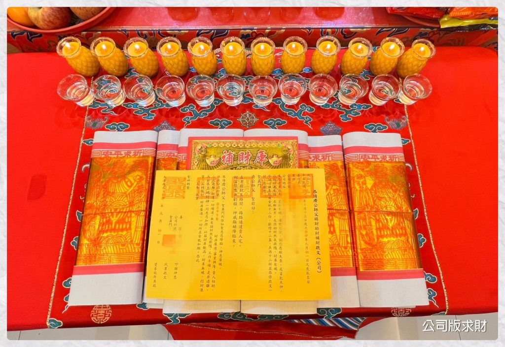 ◎ 費用包含金紙十二份、財神燈十二盞、美酒十二杯、公司求財疏文一份敬獻。
