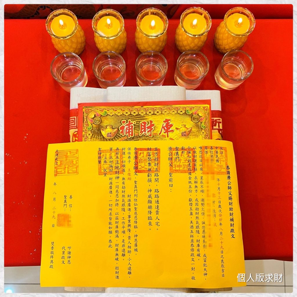 ◎ 費用包含金紙五份、財神燈五盞、美酒五杯、個人求財疏文一份敬獻。