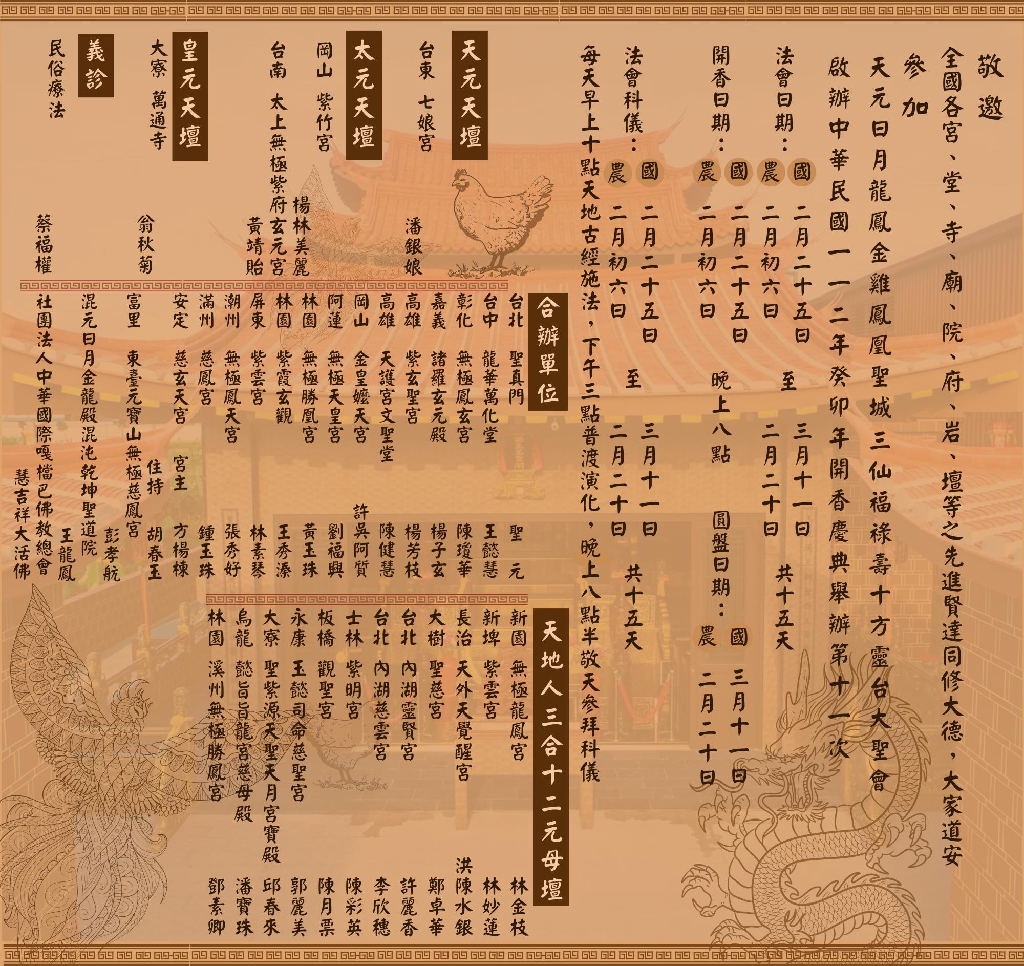 天元日月龍鳳金雞鳳凰聖城三仙福祿壽十方靈台大聖會邀請函