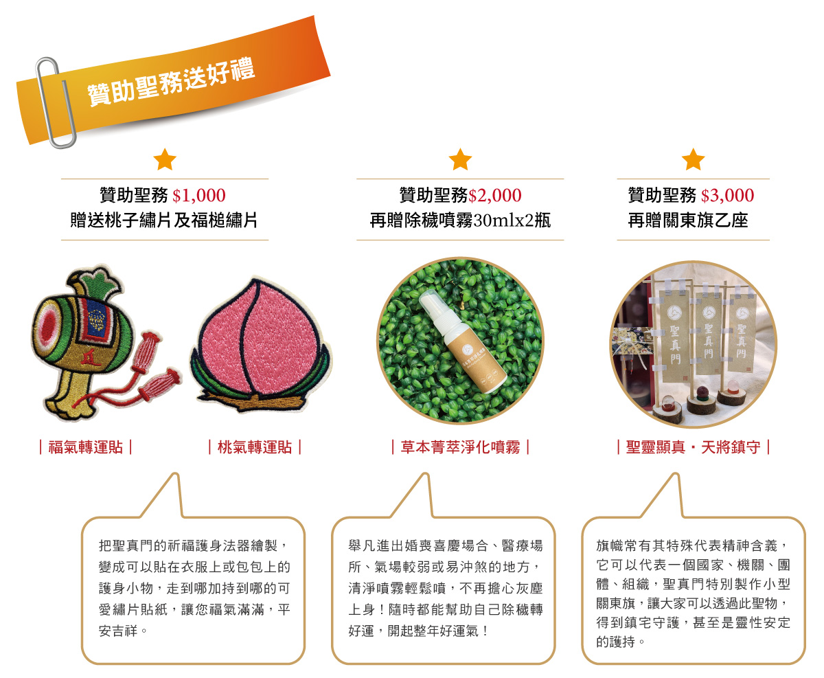 聖真門為各位捐獻大德造冊填稟文疏,逐一稟上,並祈請眾神加持「福氣轉運貼、桃氣轉運貼、草本菁萃淨化噴霧、聖靈顯真天將鎮守關東旗」,祈願功德同享,一切吉祥如意。