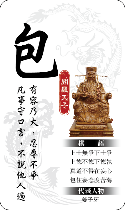 包:有容乃大,忍辱不爭,凡事守口言,不說他人過。
