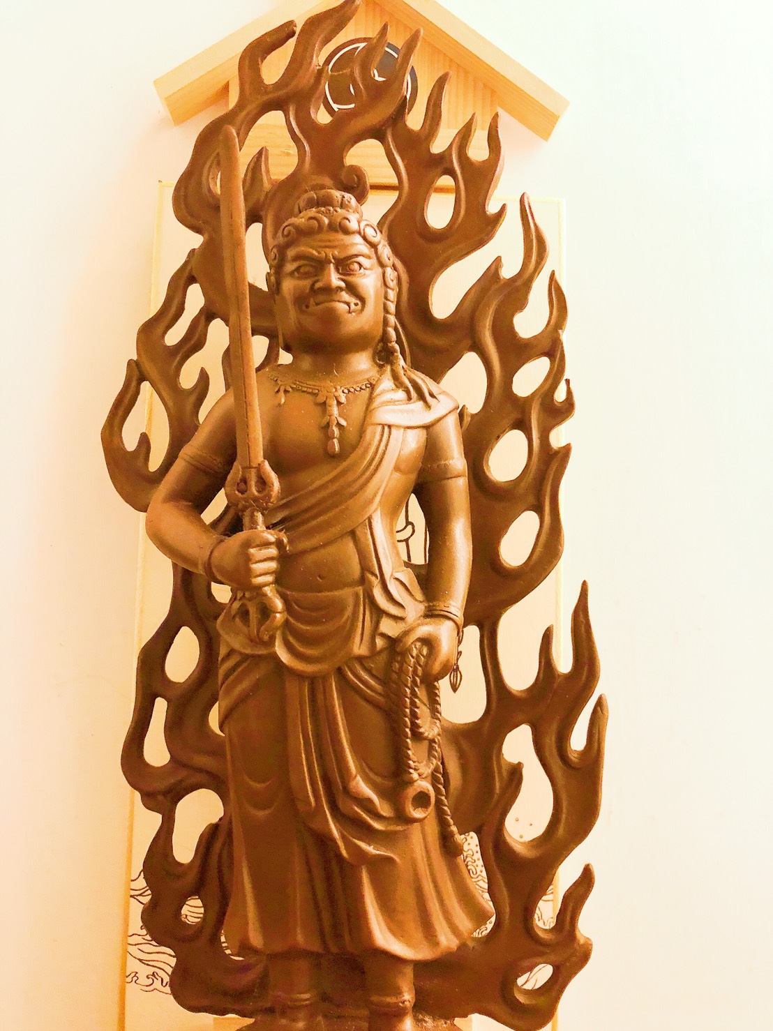 與不動明王剛開始的緣分,是來自於日本的巡禮,印象比較深刻的是,那次到了高野山,於浪切不動明王處多有接觸與感應,後來在高野山的靈寶館極近的距離下見到了很大尊的木雕不動明王,當下十分震撼與感動,也許是這樣的契機開始,漸漸的覺得與不動明王距離拉得很近。