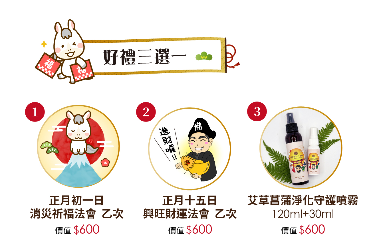 即日起至115年2月12日(農曆乙巳年12月25日)前,只要奉點光明燈全餐 (共七燈) 即贈送➡好禮三選一!以下任選一個項目免費贈送給您!