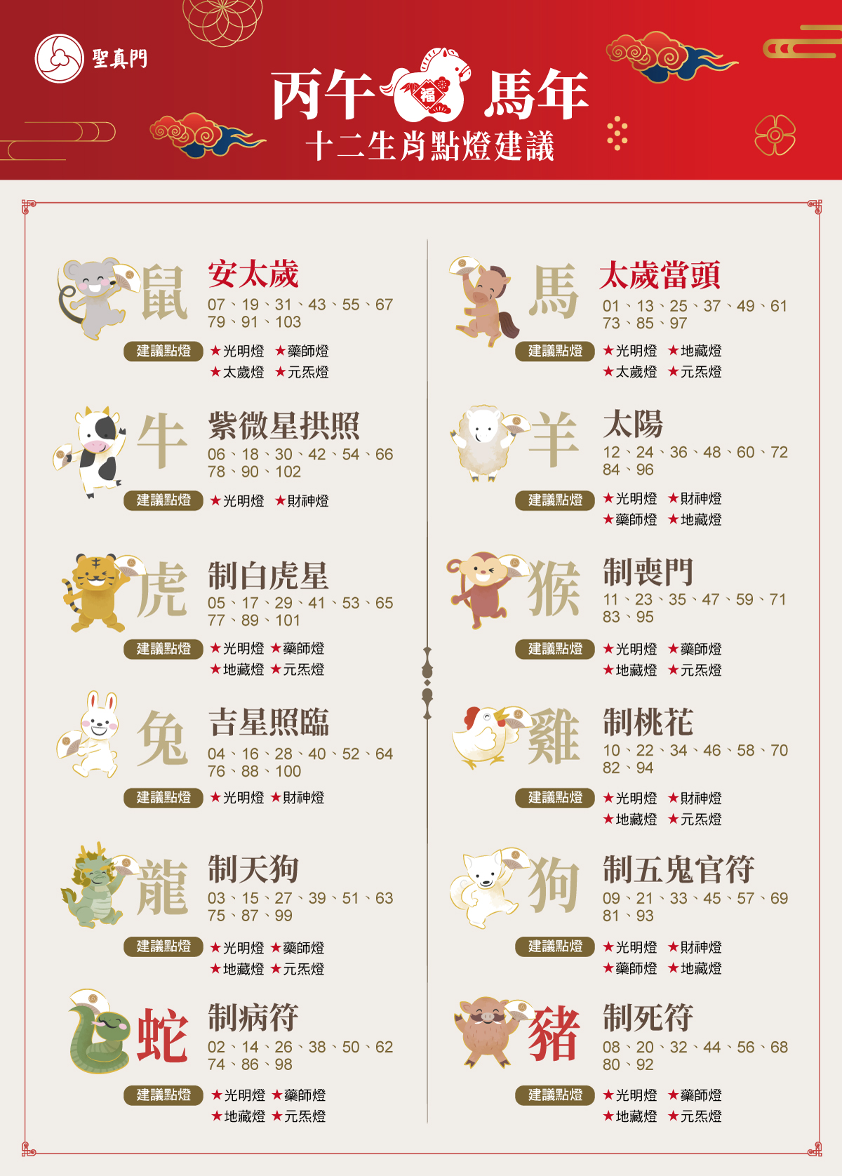 以上為各生肖在 2026 年的基本點燈建議,由聖元師父親自為每個生肖評估在丙午年需要點的燈,若您在新的一年中,有學生需要參加升學考試、公職考試或各類證照測驗,建議可額外加點《文昌燈》,以助思緒清明、智慧開啟。另外《光明燈》為全年運勢的基礎能量,建議無論生肖皆可點上一盞,作為全年的守護與加持。若想補充更多正能量、提升整體好運勢,也非常推薦加點《元炁燈》,為自己注入更穩定、強化的能量場。